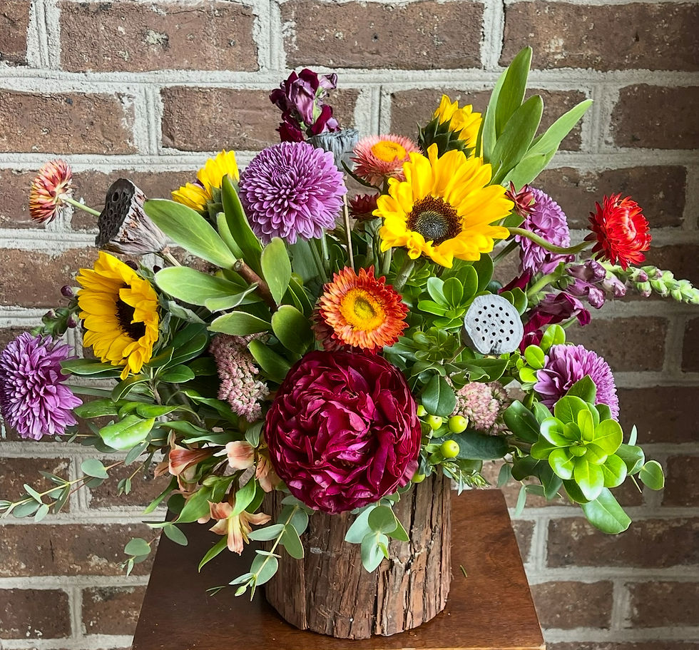 Our Queen Bee Table Arrangements are lush, garden-inspired centerpieces designed to make a statement. Each one features a thoughtfully curated mix of premium blooms, seasonal flowers, and textured greenery, arranged in a full, all-sided style. Perfect for dinner parties, small gatherings or special occasions, these arrangements are designed to be both elegant and approachable—abundant without feeling fussy. Please read the descriptions carefully. Customization is only offered in certain sizes and arrangement styles. Online ordering for porch pick-up only. To order table arrangements for delivery and set-up, please text Molly at 843-269-4639.